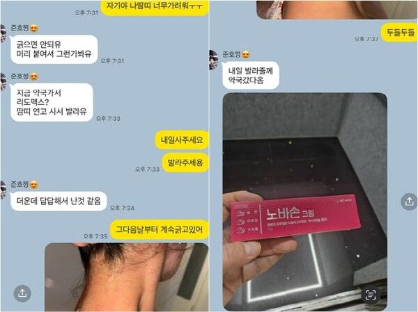 이에 김지민이 "내일 약 사 줘라, 발라 달라"고 애교 섞인 부탁을 건네자, 김준호는 지체 없이 "내일 (약) 발라줄게, 약국 갔다 옴"이라며 연고 사진을 찍어 보내는 '약국 인증'까지 마쳤다.