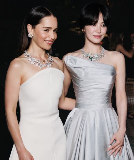 최근 송혜교는 자신의 소셜 미디어(SNS)에 근황을 담은 여러 장의 사진을 게재했다. 공개된 사진 속에는 은은한 광택이 감도는 실버 드레스를 입은 송혜교와 순백의 화이트 드레스를 입은 에밀리아 클라크가 나란히 서서 포즈를 취하고 있다. 두 사람 모두 화려한 보석 목걸이를 착용했지만, 그보다 더 눈길을 끈 것은 압도적인 미모와 아우라였다.