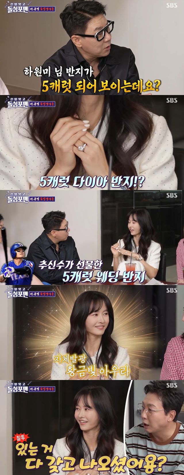 이날 하원미는 왼손 약지에 큼직한 반지를 착용한 채 등장해 시선을 사로잡았다. 이를 본 이상민은 "얼마 전에 아내랑 웨딩 반지를 둘러봤는데 착용하신 거 보니까 5캐럿 되어 보인다"며 하원미의 반지를 언급했다.