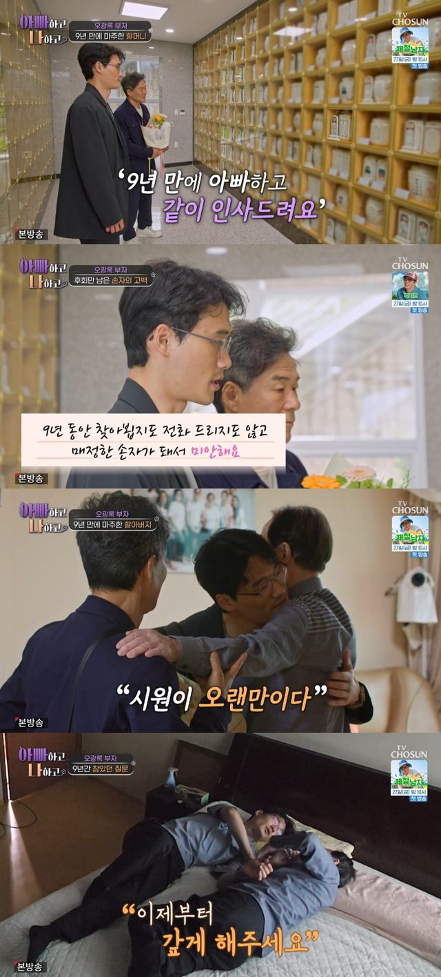앞서 오시원은 조모의 납골당에서 절절한 마음을 드러냈던 바 있다. 오광록은"시원이 왔어요, 어머니"라며 9년 만에 마주하는 손자를 소개했고, 조모의 사진을 빤히 보던 오시원은 "내려오는데 할머니가 여전히 안아줄 것 같았다. '우리 강아지 왔냐' 하면서"라며 말을 잇지 못했다.