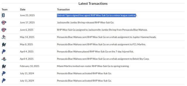미국 프로야구 마이너리그 공식 홈페이지 내 고우석 네임 카드 '최근 이동' 현황이 추가됏다. 자유계약선수(FA)인 그가 디트로이트 타이거스와 마이너리그 계약을 했다는 내용이다.