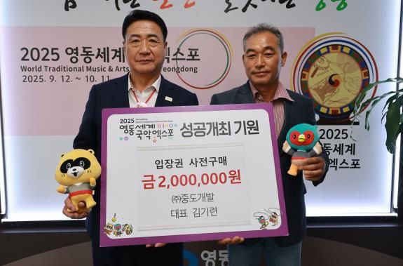 [파이낸셜경제=김영란 기자] ㈜중도개발 김기련 대표는 지난 24일 영동세계국악엑스포 입장권 구매를 위한 성금 200만원을 영동군에 전달했다.