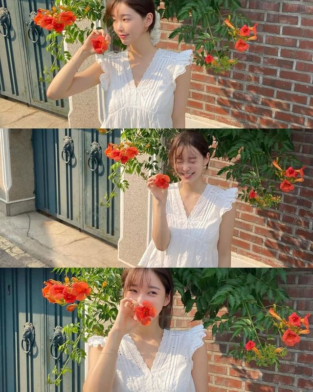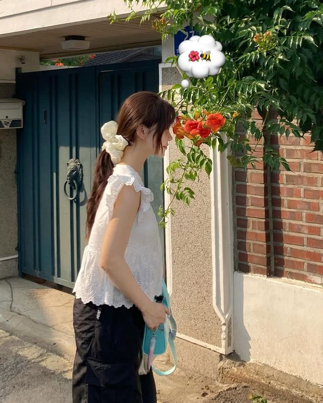 “민낯에 선크림만 발라도 이 코디라면 자신 있어!”라는 댓글처럼, 많은 팬들은 김윤희의 꾸안꾸 여름 스타일에 열광했다. 능소화 앞에서 브로더리 블라우스를 입은 그녀의 모습은 그 자체로 한 장의 엽서처럼 사랑스럽고 시원한 장면을 연출한다.