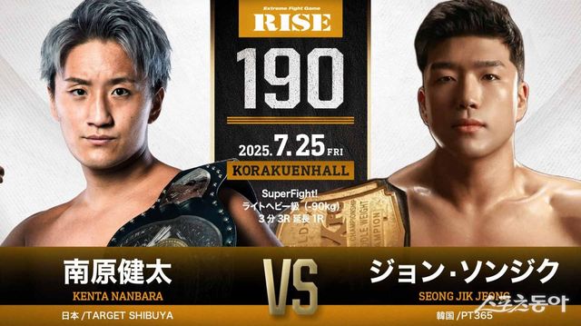 국내 최대 입식격투기 단체 MAXFC의 슈퍼미들급 챔피언 정성직(35· PT365)이 일본 라이트헤비급 챔피언 난바라 켄타(27·TARGET SHIBUYA)와 격돌한다. 오는 7월 25일(금), 일본 도쿄 고라쿠엔 홀에서 열리는 ‘RISE 190’ 메인 카드로 편성된 한·일 챔피언 대결이다.