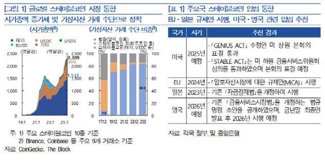 미국, 유럽연합(EU) 등 주요국들은 스테이블코인의 지속적인 확대 흐름에 맞춰 스테이블코인을 제도화하고자 하는 노력을 강화하고 있다. EU와 일본은 규제안을 시행한 반면, 미국과 영국은 관련 입법을 추진하고 있다.