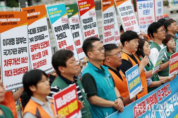 김정제 공공연대노조 고용노동본부장은 "2015년 비정규직의 정규직 전환 이후 국가기관 공무직 처우 개선은 10년째 멈춰있다"며 "정부가 사업자인 공공부문 노동자들은 최저임금이 최고임금이 되고 있다"고 지적했다.