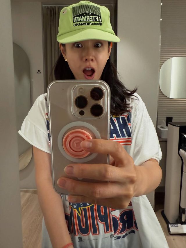 공개된 사진 속 손예진은 연두색 볼캡과 프린트 티셔츠를 매치한 힙한 스타일링에, 입을 벌리고 놀란 듯한 표정을 지으며 장난기 넘치는 모습을 보여줬다. 군더더기 없는 민낯에 장난스러운 표정까지 더해지며 평소의 고혹적인 이미지와는 또 다른 매력을 발산했다. 특히 대형 스마트폰과 개성 있는 폰 그립이 그의 센스 있는 일상을 엿보게 한다.