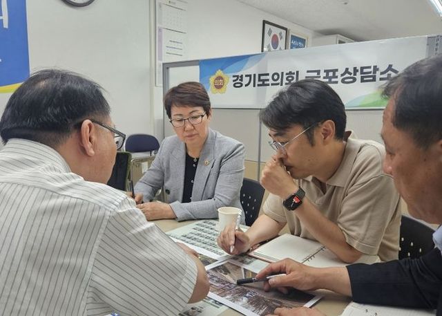 [와이뉴스] 경기도의회 성복임(더불어민주당, 군포4) 도의원은 지난 24일 경기도의회 군포 지역상담소에서 산본동 계룡아파트 김유철 동대표, 군포시청 건설과장, 도로관리팀장과 함께 계룡아파트 앞 과속방지턱 이동 및 고원식 횡단보도 보수 관련 민원을 청취했다.