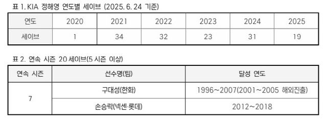 정해영은 24일 경기까지 마친 현재 19세이브로 세이브 부문 리그 3위를 달리고 있다. 1위 박영현(KT·21세이브), 2위 김원중(롯데·20세이브)을 바짝 뒤쫓고 있다. 정해영은 2024시즌 31세이브를 올리며 KBO 리그 세이브상을 수상한 바 있다.