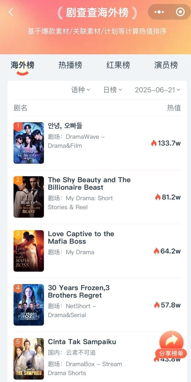 글로벌 시장조사업체 데이터아이(DataEye)가 전 세계에서 제작된 숏폼 드라마를 대상으로 리서치한 결과에 따르면 ‘안녕, 오빠들’은 최근 글로벌 랭킹 1위, 주간 전체 2위를 차지했다. 해당 리서치는 마케팅 역량 수치로 평가된다.