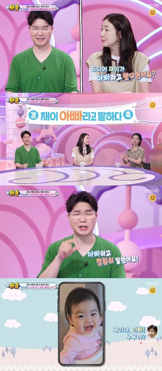 박수홍은 "재이가 '아빠'라는 정확한 워딩으로 (얘기했다)"라고 자랑했다. 이어 박수홍의 딸 재이가 '아빠'라고 또박또박한 발음으로 말하는 영상이 공개됐다. 영상 속 박수홍은 기쁨을 감추지 못했다.