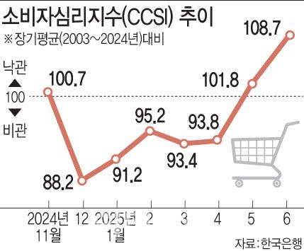 25일 관가와 국회에 따르면 지역화폐 등 민생회복 지원금이 지역 경제에 미치는 효과는 의견이 분분하지만, 소비가 일시적으로나마 살아날 것이라는 데는 이견이 없다. 소비 심리는 돈이 풀리기도 전에 들썩이고 있다. 한국은행이 최근 발표한 ‘소비자동향조사’ 결과에 따르면 6월 소비자심리지수(CCSI)는 108.7로 5월(101.8)보다 6.9포인트 올랐다. 2021년 6월(111.1) 이후 4년 만에 가장 높은 수치다.