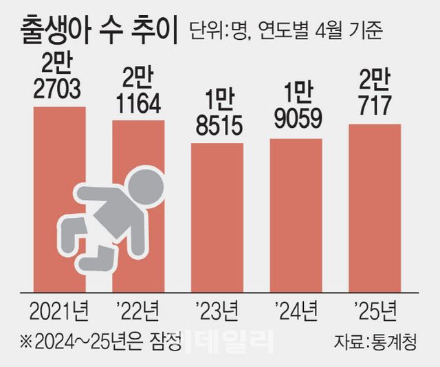 이날 통계청의 ‘2025년 4월 인구동향’에 따르면 지난 4월 출생아 수는 2만 717명으로, 전년 동기 대비 8.7%(1658명) 늘어났다. 이는 지난해 7월부터 10개월 연속 전년 동기 대비 ‘플러스’가 이어지고 있는 것이다. 1~4월 누적 출생아 수는 8만 5739명으로, 전년 동기 대비 7.7% 늘었다.