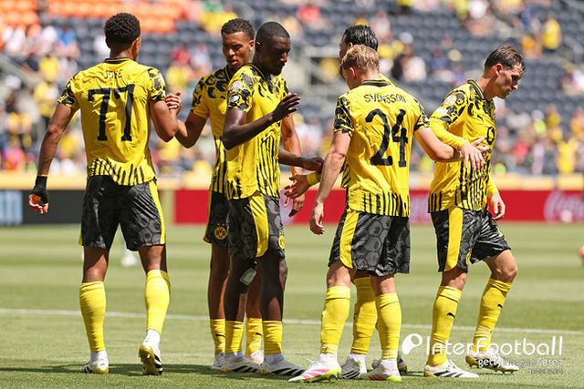 도르트문트는 3-4-3 포메이션을 꺼냈다. 최전방은 벨링엄, 기라시, 아데예미가 나섰고 중원은 스벤손, 그로스, 은메차, 뤼에르손이 구성했다. 쓰리백은 벤세바이니, 안톤, 쿠토였고 골문은 코벨이 지켰다.