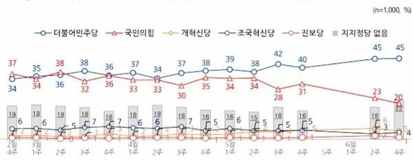 직전 조사(6월 2주차)와 비교하면 민주당은 변동이 없었고, 국민의힘은 3%포인트 하락했다.