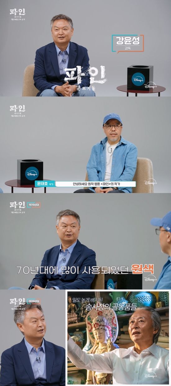 공개된 영상은 연출을 맡은 강윤성 감독과 원작 웹툰을 집필한 윤태호 작가가 등장해 '파인: 촌뜨기들'만의 장르적 매력과 프로덕션 비하인드를 직접 전한다. 두 사람은 '원작'과 '1970년대'라는 두 가지 키워드를 중심으로 서로에게 질문을 주고받으며 작품을 깊이 있게 풀어내 예비 시청자들의 기대감을 끌어올린다.