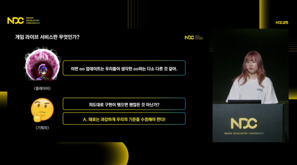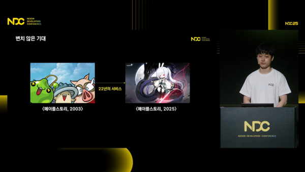 강연에 나선 개발진은 라이브 서비스 게임을 향한 이용자들의 기대는 시시각각 변화하는 한편, 그 수많은 기대 속에서도 변치 않는 기대가 있다는 두 방향에서의 ‘메이플스토리’의 여정과 대응을 설명했다.