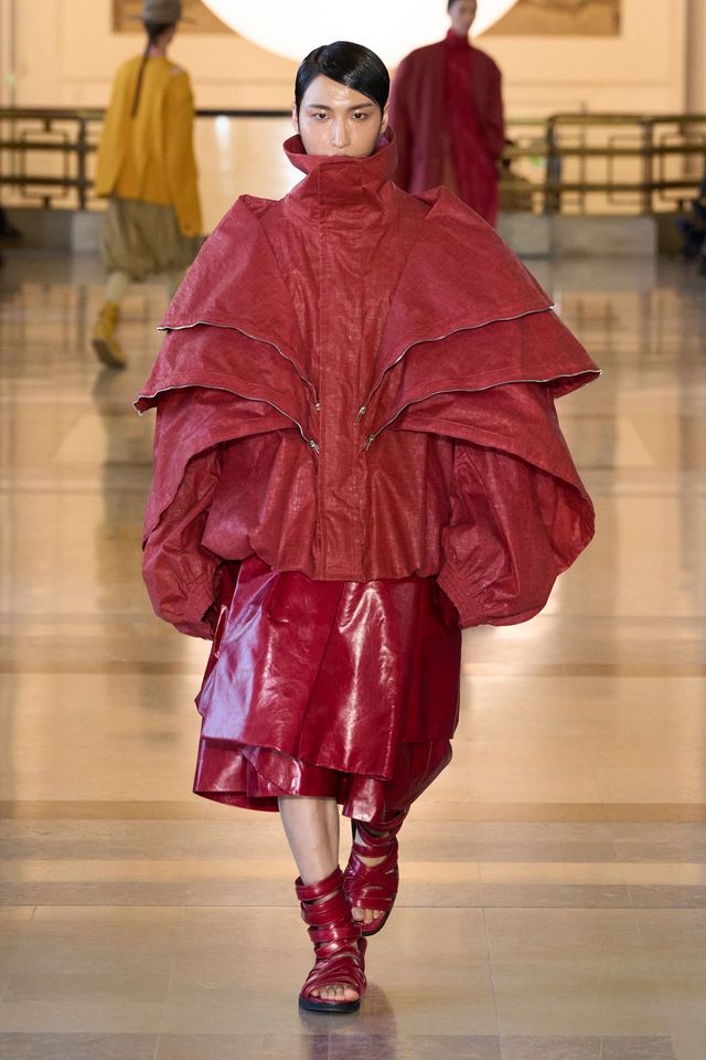 이번 런웨이에서 성화는 두 가지 서로 다른 무드를 가진 룩을 소화했습니다. 첫 번째는 강렬한 색감이 시선을 사로잡는 레드 룩입니다. 어깨를 감싸는 여러 겹의 집업 아우터에 지퍼가 달려있어 확장성과 구조미를 동시에 보여줍니다. 하의 또한 겹겹이 레이어드된 광택 있는 스커트로 부피감을 더했고요. 발목을 감싸는 스트랩 샌들로 강렬한 마무리를 더했죠.
