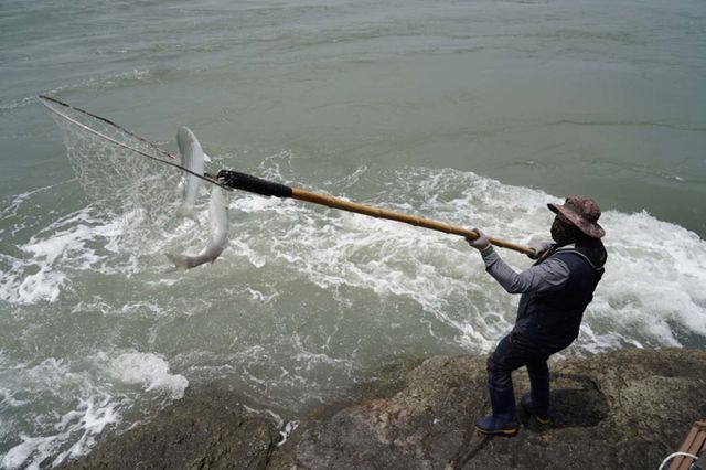 울돌목에서 뜰채로 숭어를 잡는 모습. / 연합뉴스