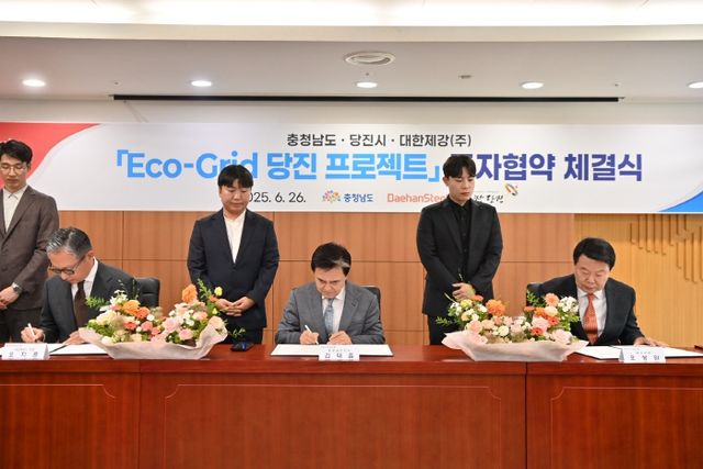 김태흠 지사는 26일 도청 상황실에서 오치훈 대한제강 회장, 오성환 당진시장과 ‘에코-그리드(Eco-Grid) 당진 프로젝트’ 추진을 위한 투자양해각서를 체결했다.
