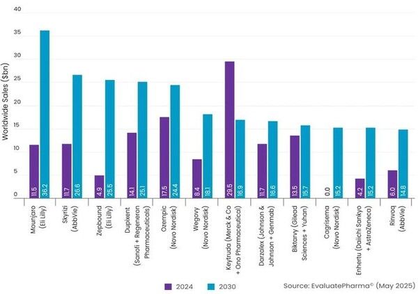 구체적으로 일라이 릴리의 마운자로와 젭바운드는 각각 2030년 가장 많이 팔린 약물과 세 번째로 많이 팔린 약물이 될 것이라는 예측이다.