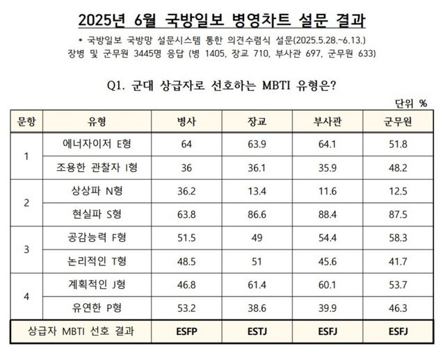 국방홍보원 국방일보는 지난 5월 28일부터 6월 13일까지 현역 장병 및 군무원 3445명을 대상으로 ‘군대 상급자로 선호하는 MBTI 유형’에 대한 병영 차트 설문조사를 진행했다고 26일 밝혔다. 조사는 국방일보 인트라넷(국방망) 설문 시스템을 통해 이뤄졌다.
