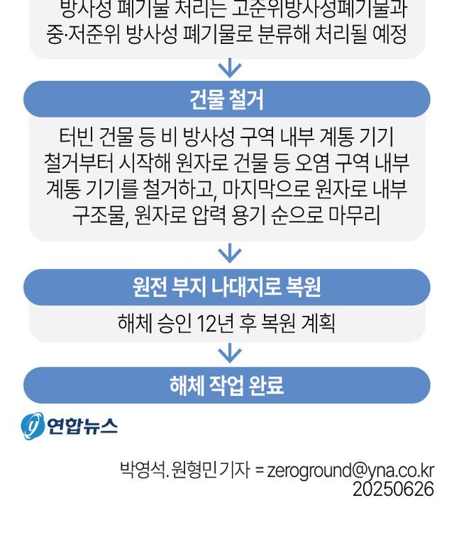 해체를 진행하면 중준위 65t, 저준위 8천941t, 극저준위 4천315t, 자체처분 15만8천387t 등 총 17만1천708t의 폐기물이 발생할 것으로 전망되며 고체와 액체, 기체, 혼합 폐기물별 관리계획도 마련된 상태다.