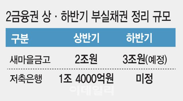 2금융권은 하반기에도 부실채권 정리 작업에 속도를 낼 방침이다. 새마을금고는 내달 8일 공식 출범하는 새 자산관리전문 자회사인 ‘새마을금고자산관리회사(MG-AMCO)’를 통해 약 3조원 규모의 부실채권을 정리할 계획이다. 이 회사는 새마을금고와 중앙회, 출자한 회사의 부실채권 매입과 추심 업무를 전담한다. 앞으로는 위임채권 추심과 여신 부대조사 업무 대행, 매입 부동산 매각 등으로 사업영역을 확장할 예정이다.