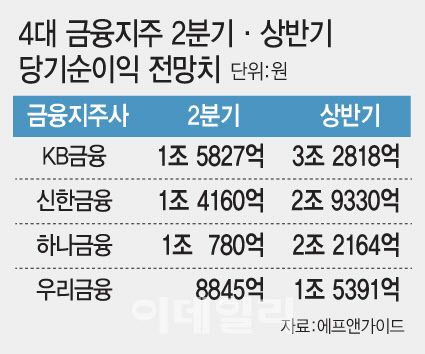 하지만 상반기 전체로 보면 4대 금융지주의 순이익 전망치는 9조 9703억원으로 지난해 같은 기간보다(9조 3526억원) 6.6% 늘어 반기 기준 역대 최대를 기록할 전망이다. KB금융이 3조 2818억원으로 리딩 금융 자리를 지키고, 신한금융 2조 9330억원, 하나금융 2조 2164억원, 우리금융 1조 5391억원 등으로 예상했다.