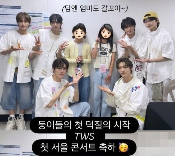 공개된 사진에는 최근 서울 송파구 잠실실내체육관에서 열린 그룹 투어스(TWS) 콘서트 대기실에서 정형돈과 쌍둥이 딸이 투어스 멤버들과 함께 포즈를 취하고 있는 모습이 담겼다. 특히 쌍둥이 딸은 투어스 멤버들과 함께 손동작을 맞춰 보이며 '성덕(성공한 덕후)'의 면모를 유감없이 드러냈다.