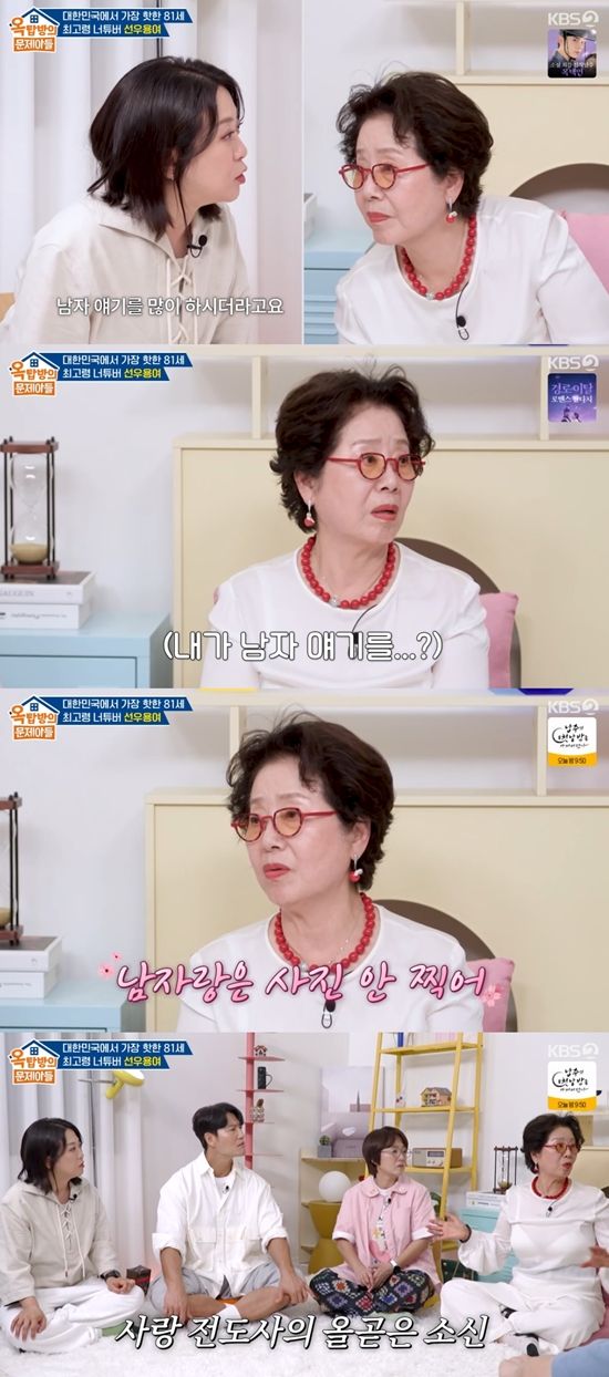 김숙은 선우용여에게 "의외로 남자 얘기를 많이 하신다"라고 말했다. 선우용여가 유튜브에서 남자 관련 얘기를 많이 꺼냈던 것. 선우용여는 "나는 남자분들이 사진 찍자고 하면 안 찍는다. 와이프를 데려오던지 다른 사람을 데려오라고 한다. 우리 남편이 살아있을 때는 다 찍었다"라며 남자 팬과는 사진을 찍지 않는 이유를 밝혔다.