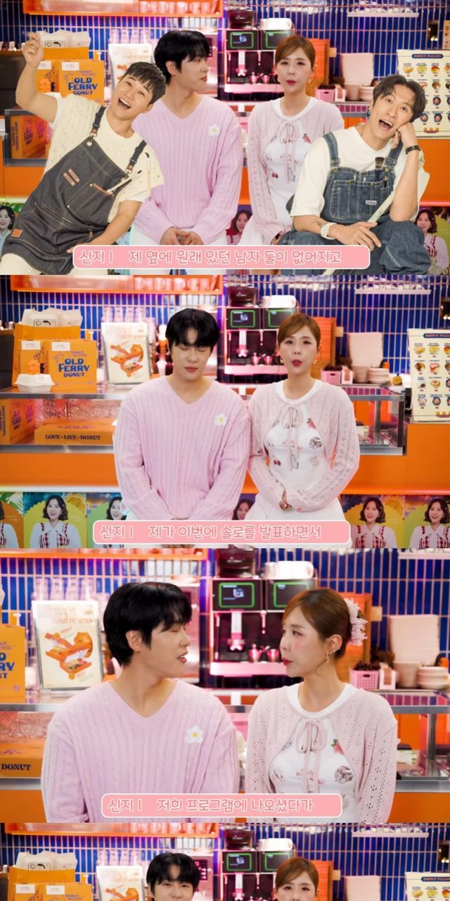 신지는 "지금 굉장히 낯선 장면이다. 원래 있던 남자 둘이 없어지고 이상한 처음 보는 남자가 옆에 있다. 제가 솔로를 발표하며 듀엣을 하게 됐다"고 운을 뗐다.