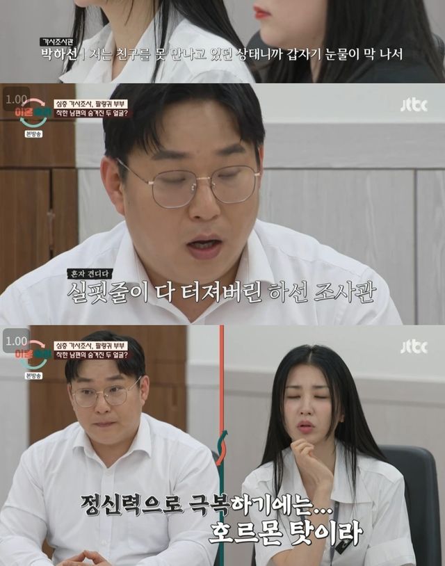 박하선은 "그래서 보니까 얼굴에 실핏줄이 다 터져 있었다. 너무 참고 참으니 얼굴이 다 터져 있었다. 그때 '얘가 심각하구나' 했다더라. 정신력으로 극복하기엔 호르몬이라 쉽지 않다. 그리고 (팔랑귀 아내는) 육아도 계속 하고 있다"고 털어놨다.