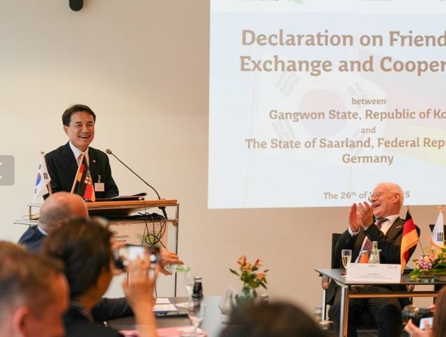 강원자치도는 이날 독일 잘란트주와 지속적 협력 관계 토대 구축을 위한 우호교류협정을 체결하고 경제, 통상, 혁신 및 기술 등 분야에서 교류를 추진하기로 약속했다.