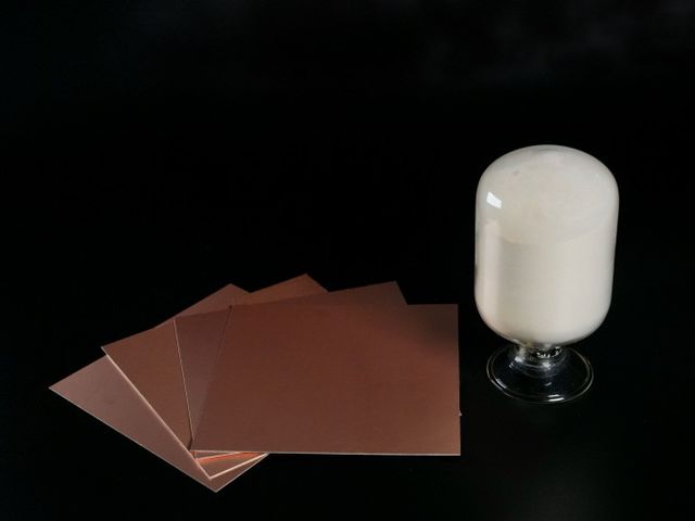 코오롱인더스트리 저유전 소재 mPPO(우측)와 이를 적용한 동박적층판(CCL·좌측). ⓒ 코오롱인더스트리