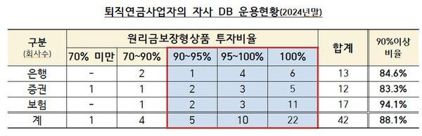 DB 제도를 운영하는 총 42개 퇴직연금 사업자들의 운용 실태를 분석한 결과, 37개사는 적립금 90% 이상을 원리금 보장형 상품으로 운용 중이었다. 수익률도 4.37%에 불과해 전체 평균(4.04%) 수준이었다.