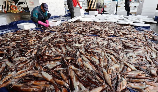 어판장에서 어민들이 어선이 잡아온 동해안 오징어를 선별해 상자에 담고 있다. 최근 동해안에서는 그동안 좀처럼 잡히지 않았던 오징어 어획량이 크게 늘어났다. 기사 이해를 돕기 위한 자료 사진 / 연합뉴스