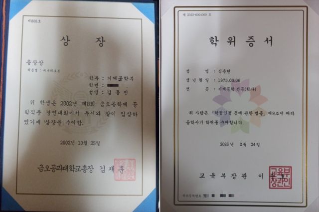 일하는 동안 공부에 목이 말랐던 김 씨는 경북 구미에 있는 금오공대 기계공학과에 편입했다. 2002년, 4족 보행 로봇 작품으로 학내 경연대회에 출전해 기계공학부 총장상도 받았다. 휴학 중, 그는 대구의 한 레고교육센터에서 학원강사로 일을 시작하며 학교로 돌아가지 못했다. 공부를 마친 건 이보다 20년이 더 지난 2023년이다. 태안화력발전소를 다니던 와중 학점은행제로 공부를 병행하며 기계공학 학사를 땄다.