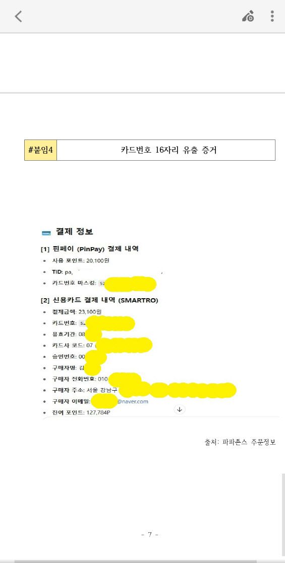 27일 국회 과학기술정보방송통신위원회 위원장인 최민희 더불어민주당 의원에 따르면, 일부 고객은 이름과 주소, 전화번호는 물론 카드번호 전부와 유효기간, 카드사 코드, 이메일, 잔여포인트까지 모두 유출됐다.