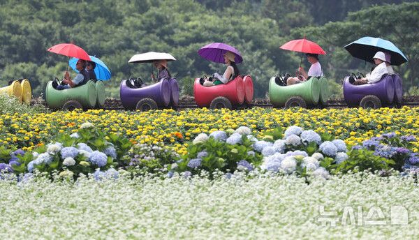 [서울=뉴시스] 장마가 소강상태에 놓인 27일 오전 제주 서귀포시 표선면 보롬왓 농장에서 우산을 쓴 방문객들이 깡통열차를 타며 즐거운 한때를 보내고 있다.