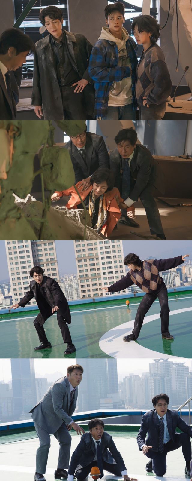 공개된 최종회 스틸컷에서 ‘무진스’ 3인방은 분진을 뒤집어쓴 채 충격적인 광경을 바라보고 있다. 콘크리트는 바스러지고 내부 철근이 듬성듬성 보이는, ‘순살’이 되어버린 빌딩은 금방이라도 무너질 듯 아슬아슬 긴장감을 자아낸다. 그 와중에 부상을 입은 문정은 의원과 혼란을 맞은 사람들의 모습이 눈길을 끈다. 대피한 옥상에서도 부실공사의 여파는 계속돼, 과연 흔들리는 건물에서 그들이 살아남을 수 있을지 최종회에 관심이 집중된다.
