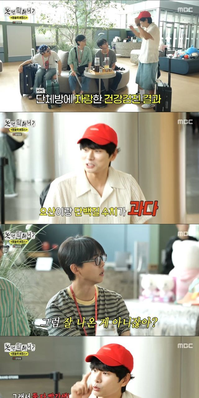 유재석이 "별 이상은 없냐"고 하자 이이경은 "별 이상은 없고, 요산이랑 단백질 수치가 하이를 찍었다"고 말했디.