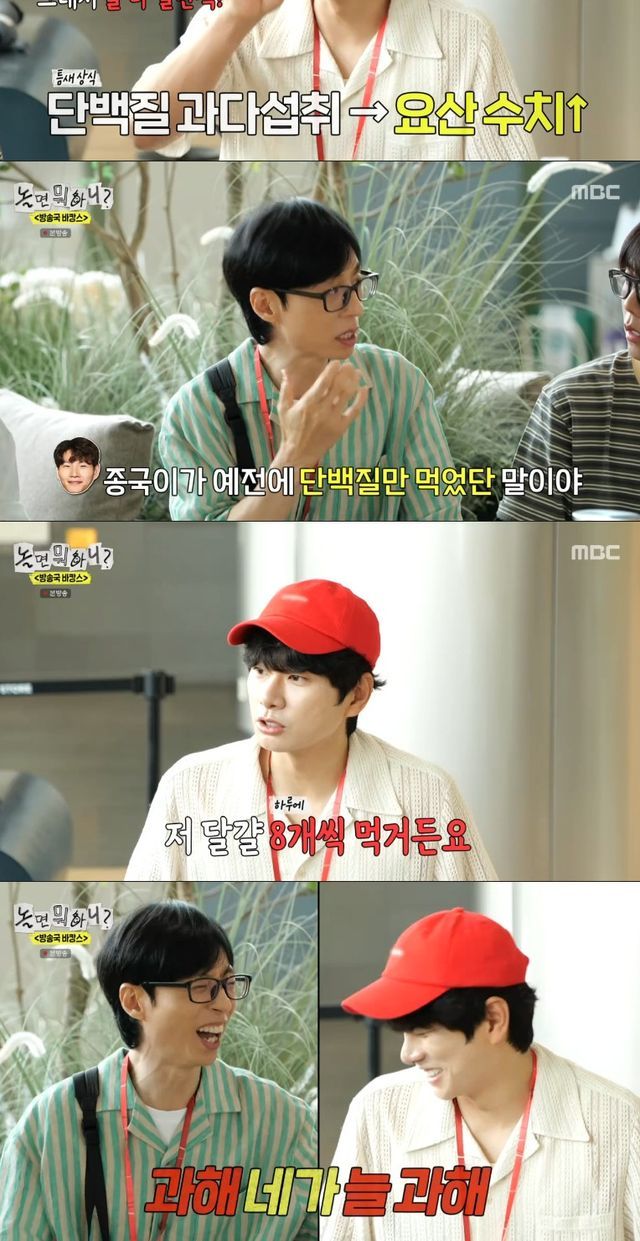 그러자 유재석은 "이거 얘기를 해줘야겠다"면서 "단백질을 너무 많이 먹으면 요산이 올라간다. 그래서 요산이 그렇게 높으면 통풍이 온다. 종국이가 예전에 탄수화물 안 먹고 막 단백질만 먹었다가 통풍이 왔다"고 설명했고, 이이경은 "저 계란 8개씩 먹거든요"라고 덧붙였다.