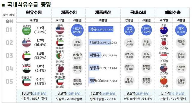 그밖에 지난 한해 나프타, 액화석유가스(LPG), 벙커C유 등 원유를 정제한 석유제품도 3억 9000만배럴 수입했다.