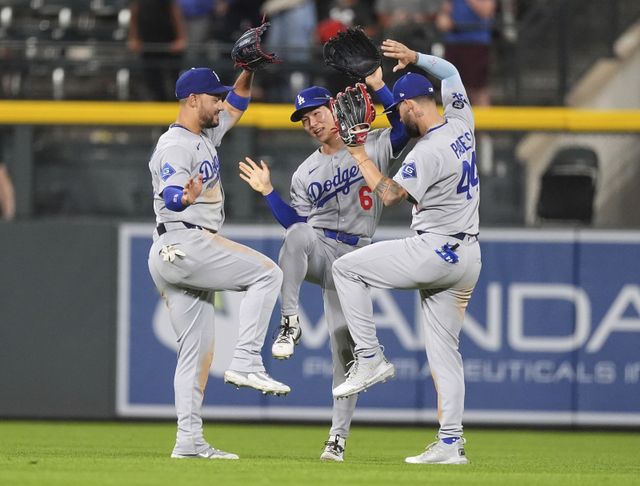 승리 후 세리머니하는 마이클 콘포토(왼쪽부터) 김혜성, 앙헬 파헤스. [AP=연합뉴스]