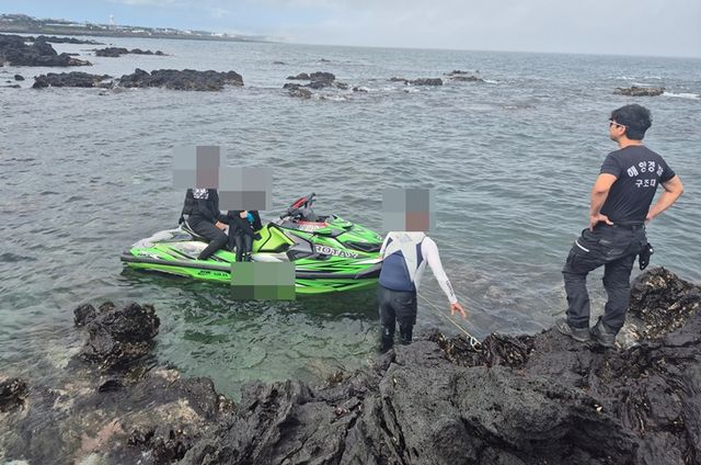 해경은 성산파출소 연안구조정을 현장으로 급파해 조류에 의해 갯바위 쪽으로 밀리고 있는 수상오토바이에서 50대 남성 2명과 8세 남 1명을 신속히 구조했다. 또한 해당 수상오토바이를 성산항으로 인양했다.