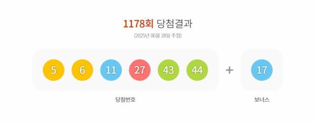 29일 동행복권 발표에 따르면, 28일 추첨된 제1178회 로또복권의 1등 당첨 번호는 ‘5, 6, 11, 27, 43, 44’이며, 보너스 번호는 17번이다. 1등 당첨자는 모두 12명으로 각각 약 23억 9160만 8407원을 받는다. 2등은 89명으로, 각 5374만 4010원을 수령하며, 3등은 3061명으로 156만 2633원이 지급된다. 4등은 15만 7044명, 5등은 265만 3841명이 나왔다.