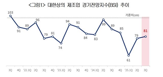 29일 대한상공회의소가 전국 제조업체 2186개사를 대상으로 기업경기전망지수(BSI)를 조사한 결과, 올해 3분기 BSI는 81로 전분기(79)대비 2포인트 상승했다. BSI는 지수가 100이상이면 해당 분기의 체감경기를 이전 분기보다 긍정적으로 본 기업이 많다는 의미고, 100이하면 그 반대다. 3분기까지 BIS는 지난 2021년 4분기(91) 이후 16분기 연속 기준치를 밑돌았다.