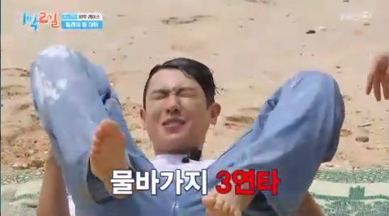 이준은 옆에 누운 딘딘에게 대야를 넘겼고 딘딘의 균형이 무너지면서 대야 속 물이 이준에게 쏟아졌다.