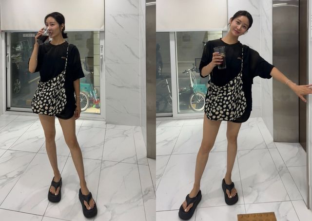 공개된 사진 속 한그루는 복도같은 공간에서 컵을 들고 커피를 급히 마시고 있는 모습이다. 특히, 루즈핏한 블랙 오버사이즈 티셔츠에 핫팬츠까지 가려지는 심플한 착장으로, 군살 없는 각선미를 강조했다.